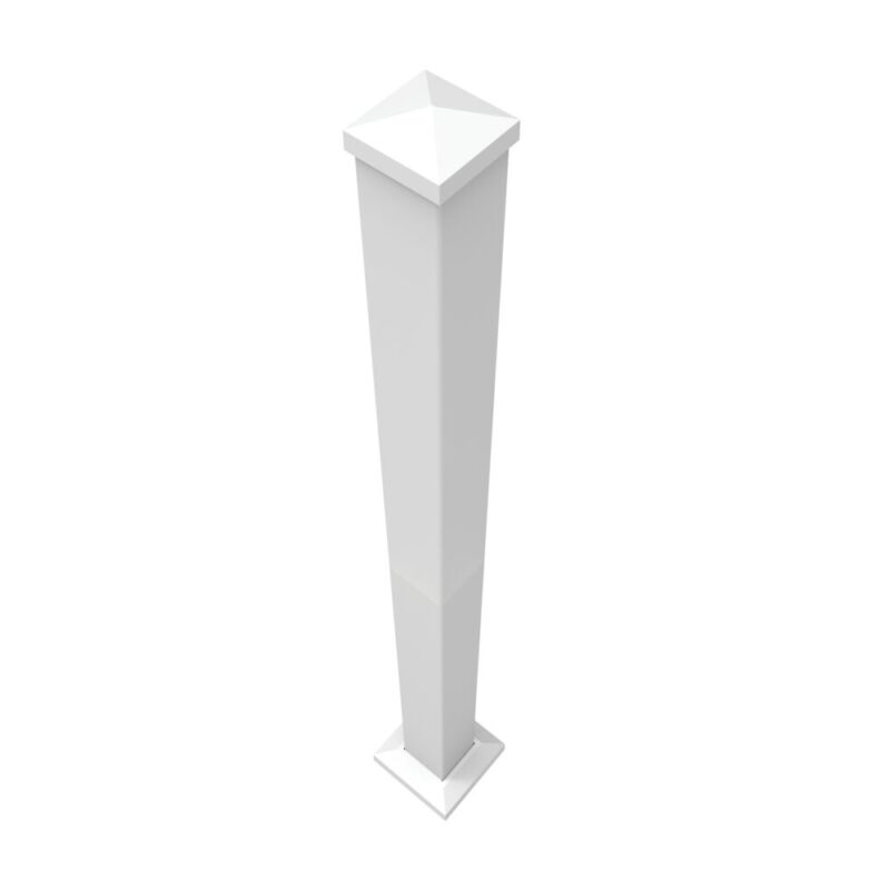 2.5in x 39in White Railing Post with Trim. Posts include a connected base plate, sandwich plate, trim ring, post cap, and two vinyl shims. Remember to order a longer post for the end post at the bottom of a stair rail section.