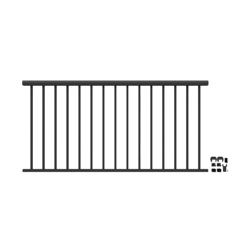 36in x 6ft Black Clarion Rounded Flat Top Railing Kit includes top & bottom rails, balusters, locking strips, brackets, & center supports.