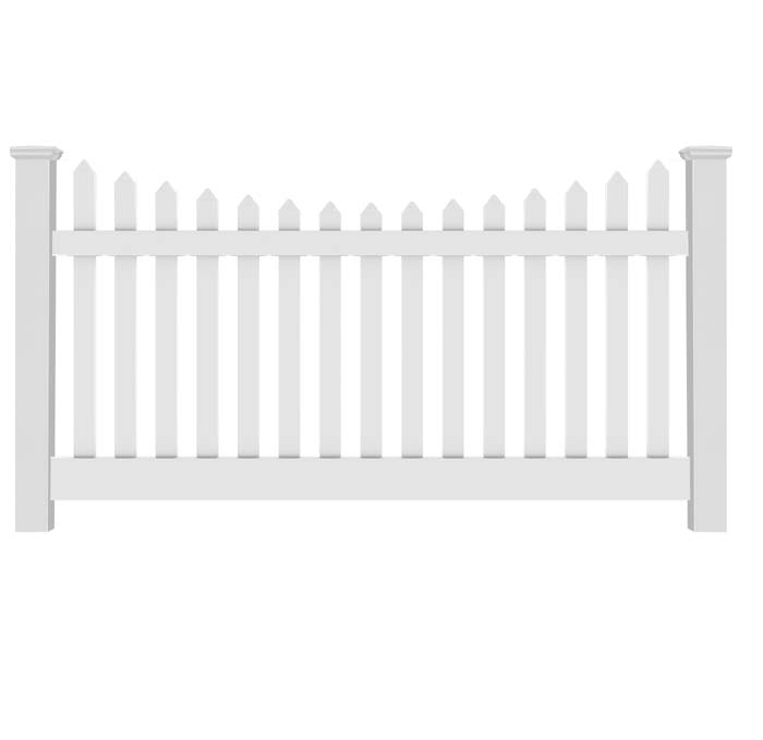 4' H x 8' W Richmond Picket Contemporary Scallop White. Package features 2" x 6" bottom rail and 2" x 3 /12" top rail along with 7/8" x 3" pointed pickets with 2.87" spacing.