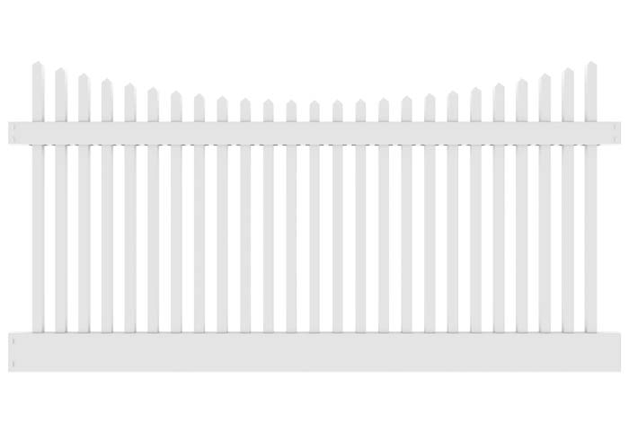 4' H x 8' W Wharton Creek Picket Classic Scallop White. Package features 2" x 6" bottom rail and 2" x 3 /12" top rail along with 1 1/2" pickets with 2" spacing.
