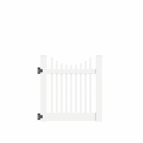 4'x46" Wharton Creek Picket Scallop Walk Gate White. Gates come with self-closing wrap hinges, but no latch. Order 2 single gates to make a double drive.