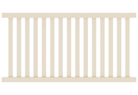 .4'x8' Baltimore Contemporary Closed Picket Tan. Package features 2" x 3 1/2" bottom rail and 2" x 3 1/2" top rail along with 7/8" x 3" pickets with 2.875" spacing. This style meets the BOCA pool code.