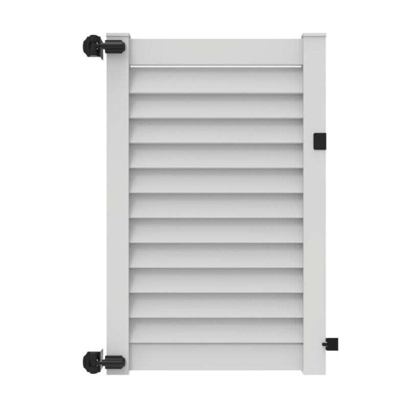 6'H X 46” W Louvered Vinyl Privacy Gate White. 13 - angled vinyl horizontal slats. We suggest having the public side of your panel be the downward angle of the slats to reduce the ability to climb the panel. There is a left-end post and a right-end post to complete the frame of the gate.