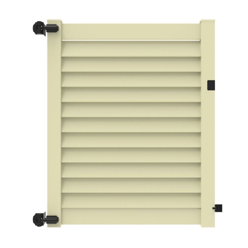 6'H X 58'W Louvered Vinyl Privacy Gate Tan. 13 - angled vinyl horizontal slats. We suggest having the public side of your panel be the downward angle of the slats to reduce the ability to climb the panel. There is a left-end post and a right-end post to complete the frame of the gate.