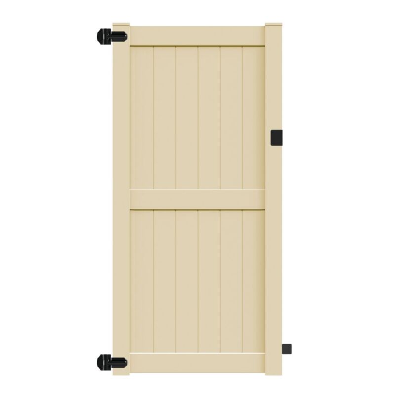 8' H x46" W Colden Walk Gate Tan. Hinges included, but latch sold separately. You will need two different post inserts for the hinge post of this gate, A 58” and a 82” insert. Please call for more information.