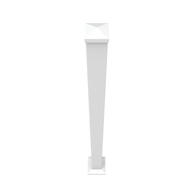 Heavy Duty 2.5in x 45in White Railing Post with Trim. Posts include a connected base plate, sandwich plate, trim ring, post cap, and two vinyl shims. Heavy Duty post is suggested for gates and stairs. Remember to order a longer post for the end post at the bottom of a stair rail section.